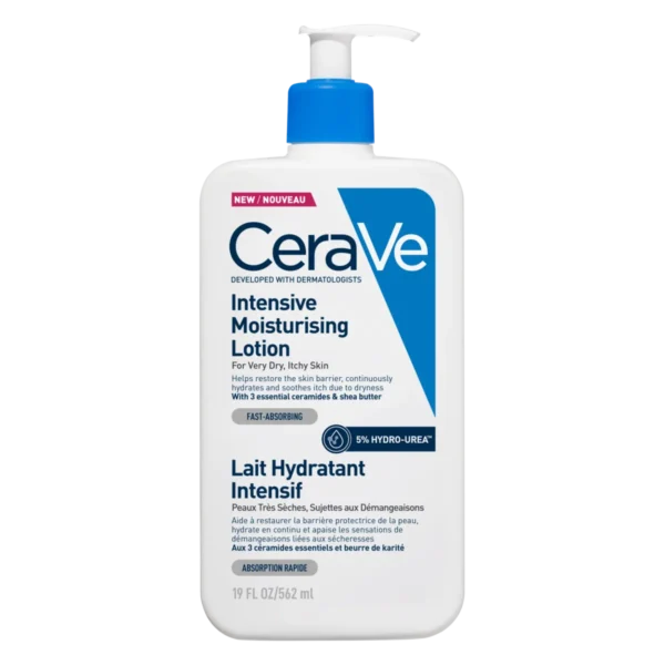 CeraVe Intensive Moisturising Lotion is designed to relieve and protect against five key signs of dryness—itchiness, tightness, rough texture, flakiness, and redness or discoloration caused by dryness. This fast-absorbing body moisturiser for dry skin penetrates the skin’s surface to provide intense hydration without leaving a greasy or sticky residue. Formulated with three essential ceramides, the lotion also strengthens the skin barrier, which can often be compromised in dry to extra-dry skin types. CeraVe Intensive Moisturising Lotion includes a blend of these three essential ceramides, plus hyaluronic acid and 5% Hydro-Urea (composed of natural moisturising factors). Featuring MVE Delivery Technology, this formula continuously releases moisturising ingredients for up to 72 hours of hydration. It’s allergy-tested, fragrance-free, pH-balanced, and suitable for all skin types, including sensitive skin. For optimal results, apply this moisturiser for dry skin daily for skin that feels smoother, softer, and healthier.
