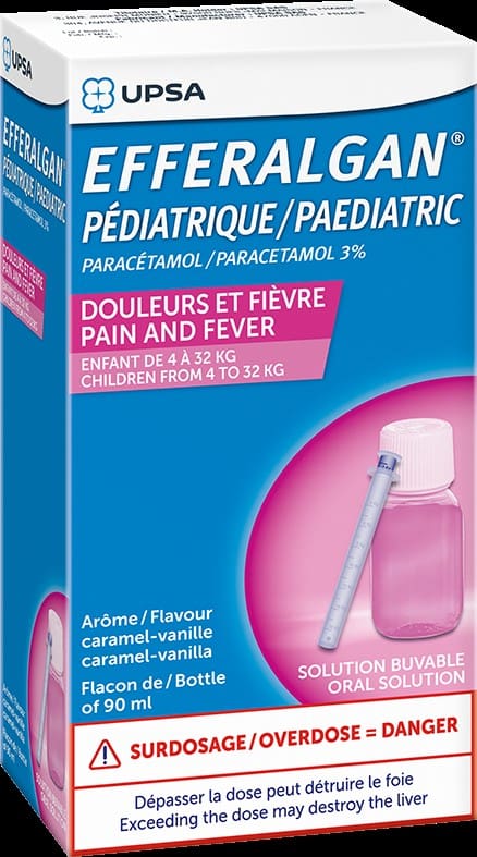 Efferalgan pediatric 30 mg/ml is an analgesic and antipyretic oral solution prescribed for fever and moderate pain in children. It contains paracetamol which helps relieve headaches, but also flu-like conditions, aches and dental pain.