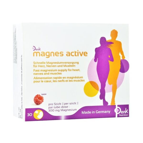 Magnes Active Denk is a food supplement that contains magnesium. It contributes to normal function of muscle and the nervous system, helps to maintain normal bones and contributes to the reduction of tiredness and fatigue. It is recomanded to use Magnesium commonly for constipation, as an antacid for heartburn, for low magnesium levels, for pregnancy complications called pre-eclampsia and eclampsia, and for a certain type of irregular heartbeat.