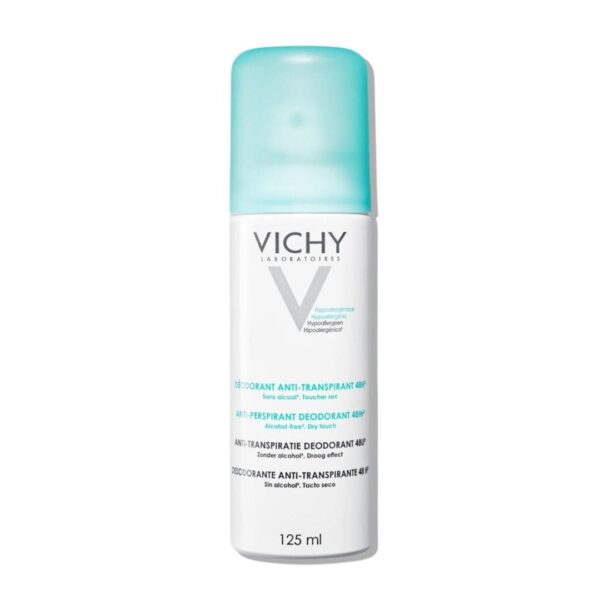 Spray Vichy Deodorant 48 Hour ‘No-Trace’ Anti-Perspirant Deodorant Spray from a distance of 15cm on to clean, dry underarms