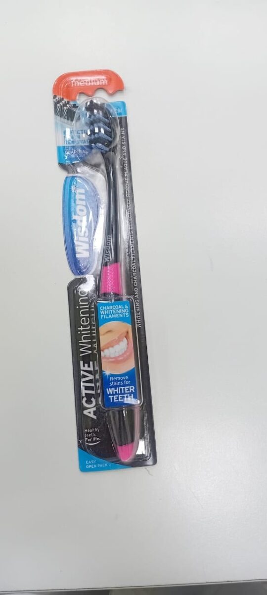 has a large surface area with pores that have a natural deodorizing and stain removal effect. Wisdom Active Whitening Charcoal toothbrush has a unique black and white striped colour which is safe to use on teeth and is easily washed away after use.Remove stains caused by tea, coffee, red wine, spicy foods and tobacco